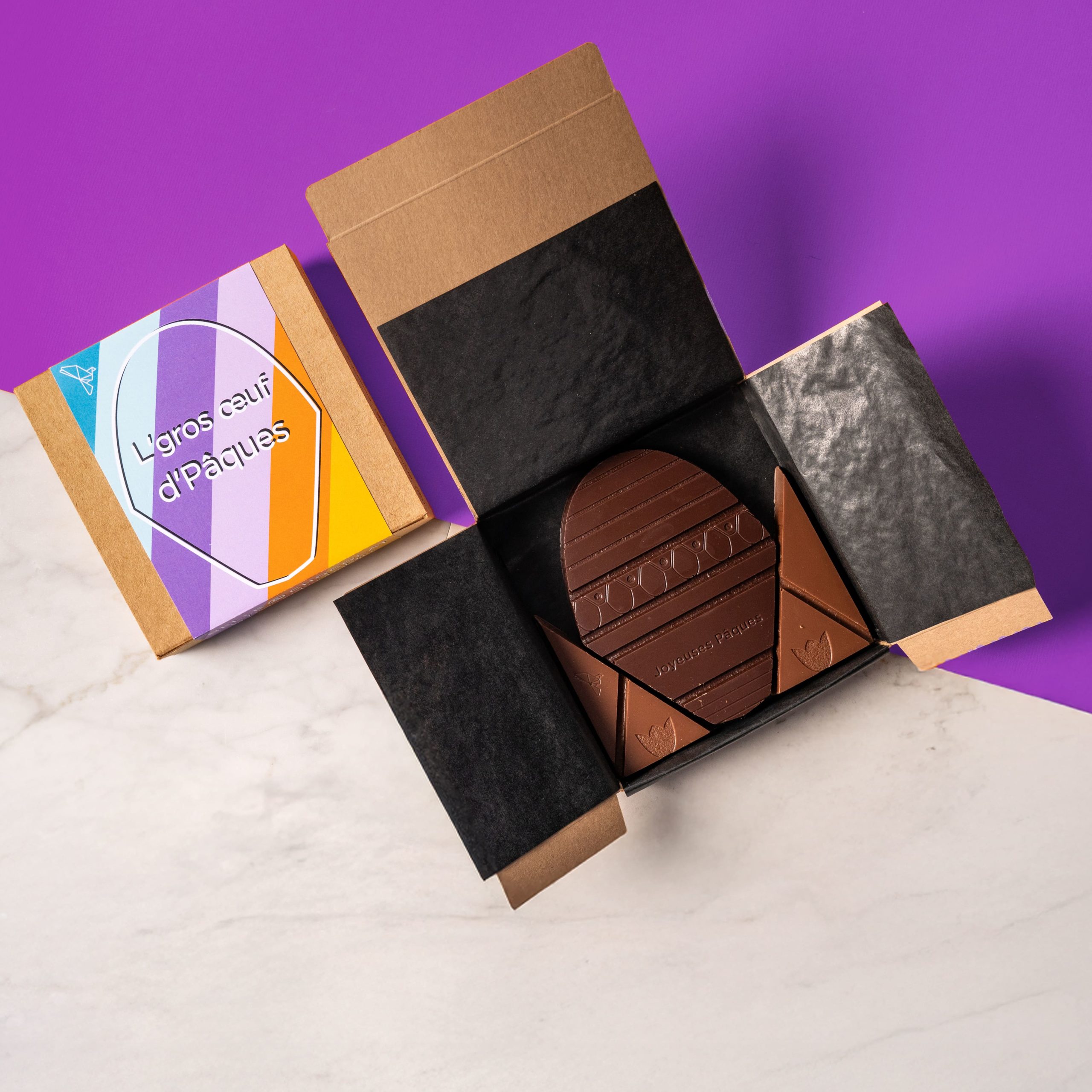 La partie “Gros Oeuf” est composée de chocolat noir du Congo 70% et d’un praliné inédit au cacao. L’occasion de vous présenter la fève de cacao sous nouvelle forme originale, avec une longueur délicieuse en bouche.