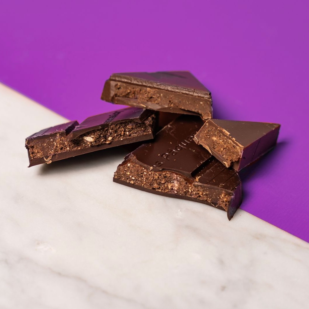 De part et d’autres de celui-ci, les triangles sont composés de chocolat au lait d’Equateur 42% et de notre incontournable praliné maison noisettes & amandes dont vous raffolez tant.