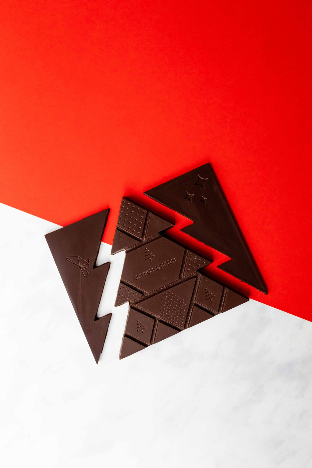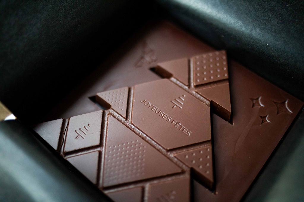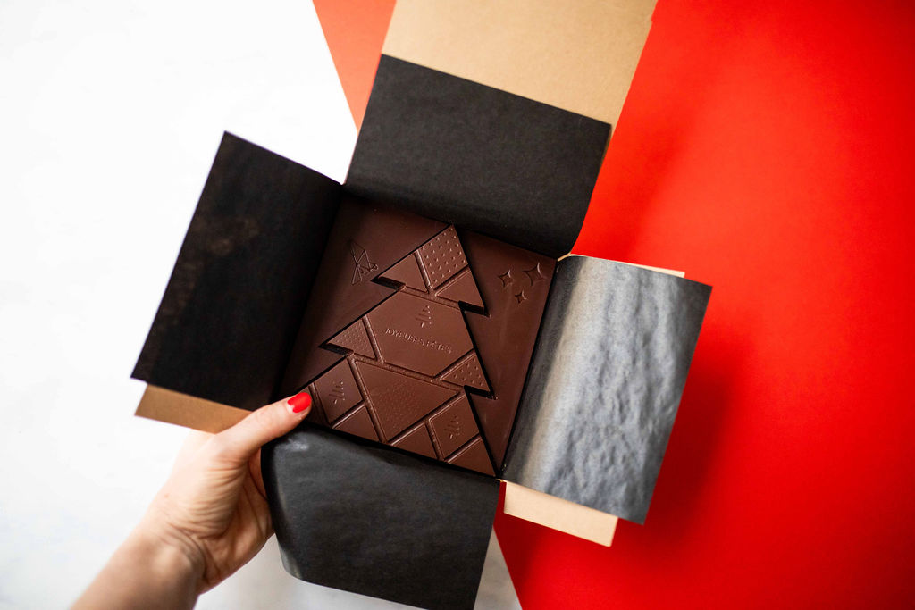 Notre sapin à craquer est une création unique. Elle est réalisée avec notre chocolat au lait intense du Congo 55% et fourrée avec un praliné au noix belge et des noix entières, caramélisées… Les pièces “nuits”, sur les côtés, sont réalisée en chocolat de Colombie 82%. Un coffret de célébration créatif, gourmand et respectueux! Joyeuses fêtes à tous…