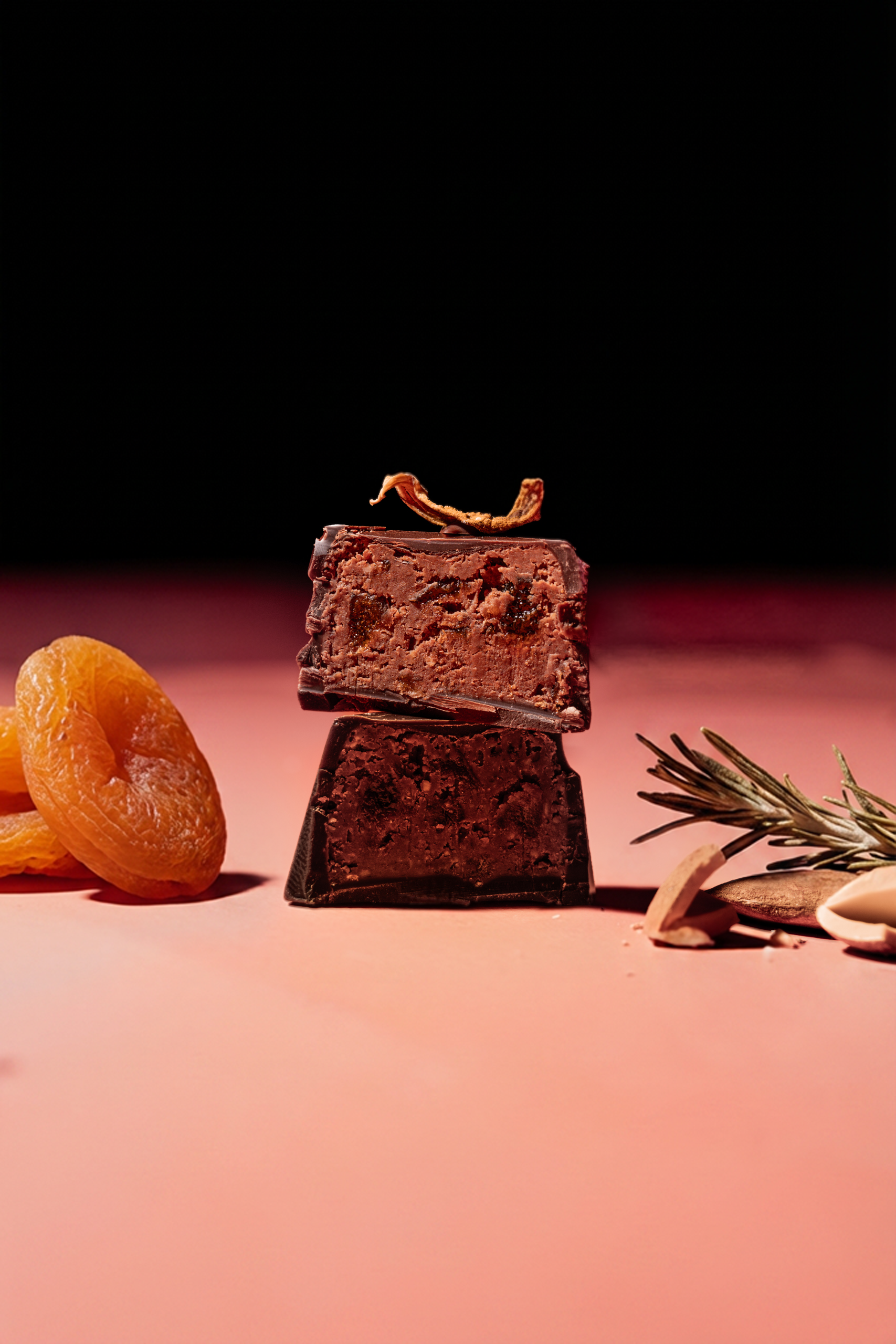 La praline au chocolat noir INTENSE de Colombie 82% est fourrée d’un praliné amande romarin et abricot.