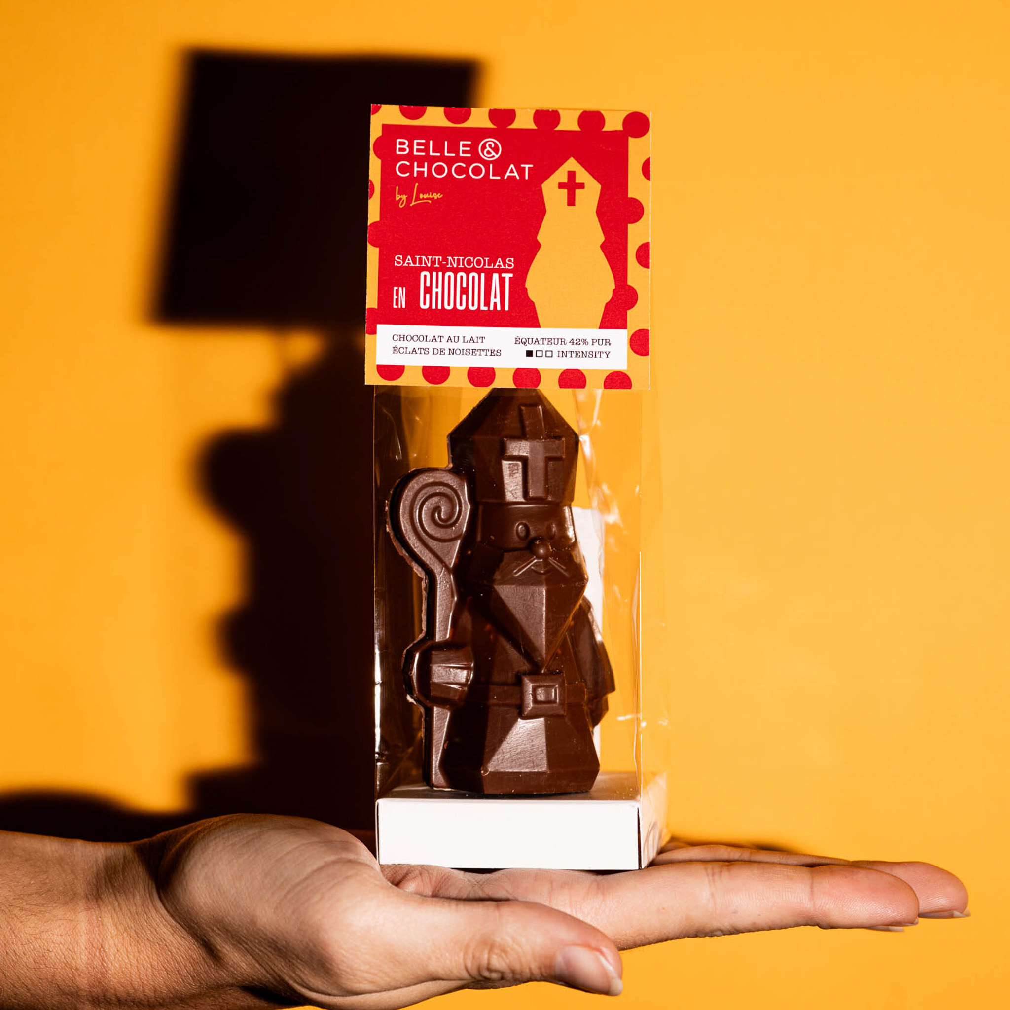 Sujet St-Nicolas réalisé avec notre chocolat 70% du Congo & éclats de noisette.